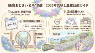 2026年の鎌倉あじさい名所10選を厳選。明月院・長谷寺の見頃予想、混雑を避ける時間帯、半日モデルコース、雨の日の撮影テクニックまで完全ガイド。